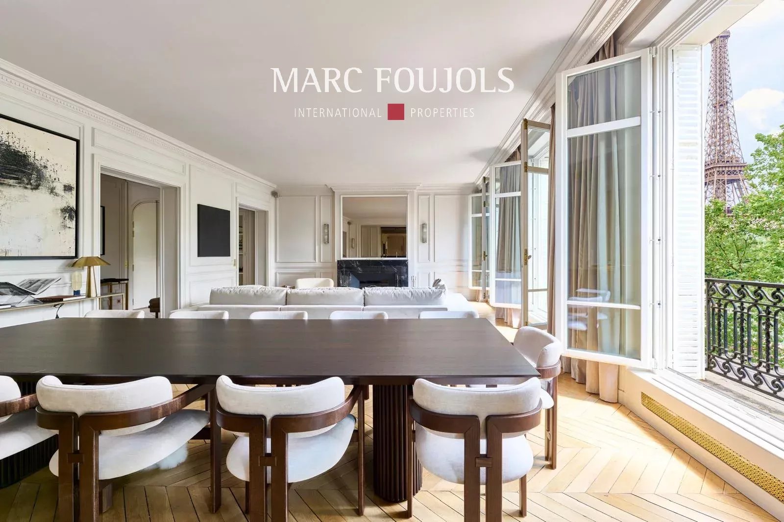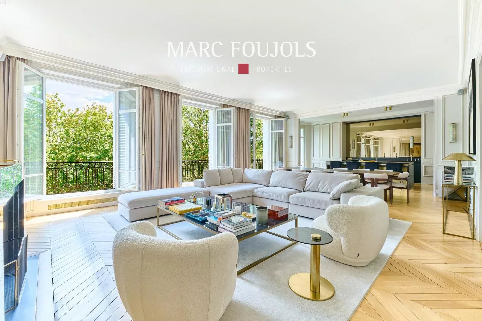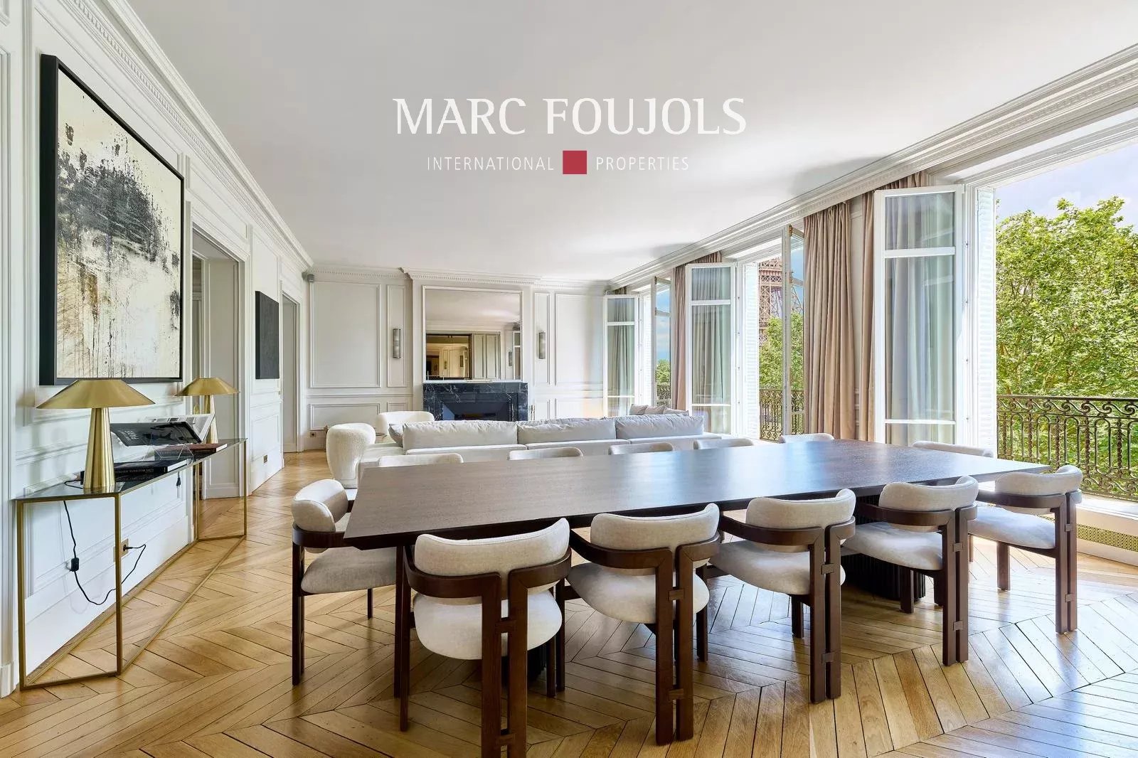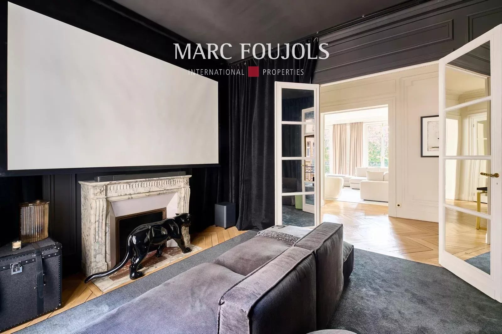 Ideally located a few steps from the Trocadéro Esplanade with a view of the Seine and the Eiffel Tower, this exceptional 245 sqm fully air-conditioned apartment recently renovated with quality materials is on the 3rd floor with elevator in a beautiful Haussmannian building. It consists of an entrance hall leading to a double reception of nearly 80 sqm, flooded with light thanks to its wide south-facing openings, offering an unobstructed view of the Eiffel Tower, followed by an open equipped kitchen with a central island. The perfectly independent sleeping area comprises a 20 sqm master suite with custom-made dressing room and bathroom. Two other bedrooms each with their own bathroom, a 22 sqm cinema room, which can be converted into a fourth bedroom completes this level. A private 25 sqm gym is located on the ground floor. Two cellars complete this exceptional property. Possibility of parking nearby.Details